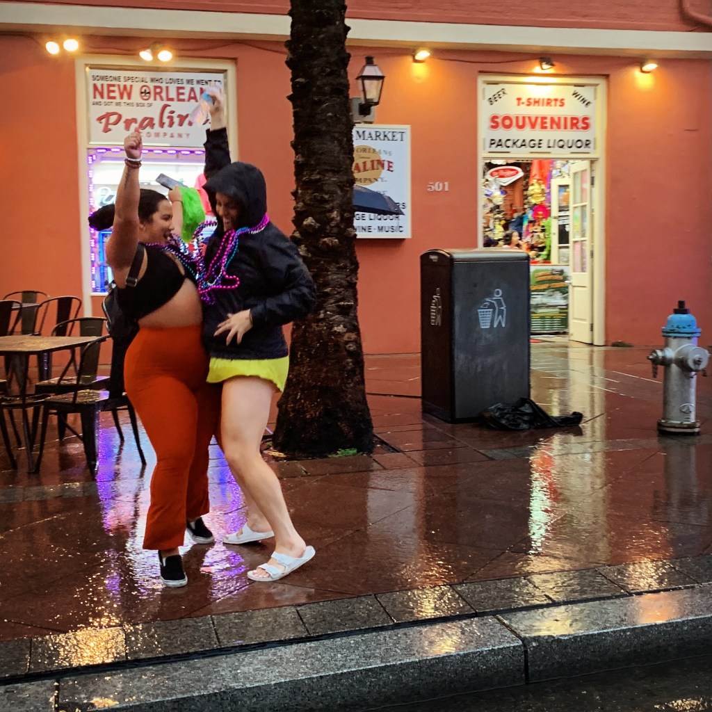 Captured during corporate parade, spectators dancing in the rain —New Orleans, May 25, 2022