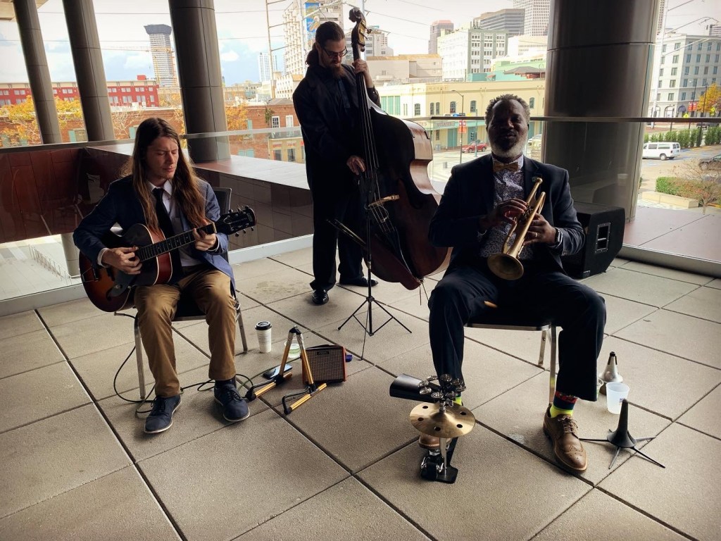 Talk Dat Talk Tuesday: Today’s weather was absolutely perfect for some good ‘ol swinging trad jazz with The Dr. Brice Miller “Taste of New Orleans” Jazz Trio doing what we do best… Bringing a GOOD TIME and High-Energy in a SMALL PACKAGE. We’re So New Orleans!