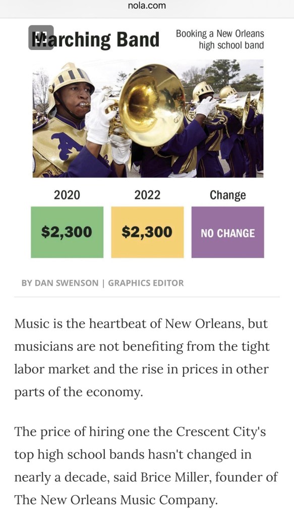 The price of hiring one of New Orleans top high school bands, for example, has hardly changed in at least a decade, said Brice Miller, founder of The New Orleans Music Company, which is a booking agent for musicians.