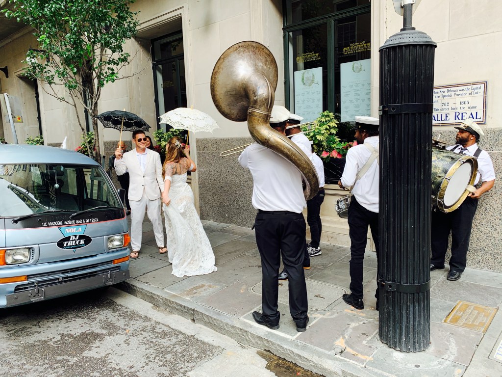 Love is a abundant and we all need a reason to simply celebrate LIFE! The pandemic caused so many couples to postpone their wedding celebrations. Well, The New Orleans Music Company loves weddings and we’re excited to be ReDefining How WE do New Orleans SECOND-LINES and STREET PARADES! This is how WE rolling, literally. Our newest NOLA DJ Truck “Lil’ Whoodie,” Mahogany Brass Band, bubbles and a cooler of wine/cold beer🍻for the bride, groom, wedding party, birthday party, bachelorette/bachelor. You can also add a Grand Marshal, Mardi Gras Indians, stilt walkers, costumed revelers or additional cultural performers. We ‘re here to assist you in having your very own STREET PARADE for any reason. Reserve your private New Orleans street party today!